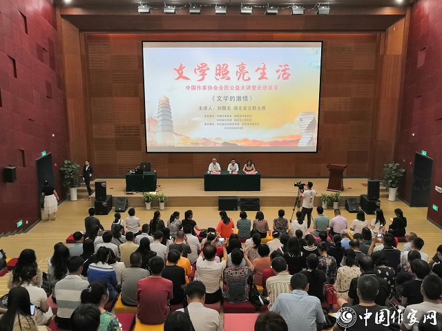 8月19日下午,由中國(guó)作家協(xié)會(huì)、陜西省作家協(xié)會(huì)、中共延安市委主辦,中共延安市委宣傳部、延安市作家協(xié)會(huì)承辦的中國(guó)作協(xié)“文學(xué)照亮生活”全民公益大講堂在延安市學(xué)習(xí)書院舉行。湖北省文聯(lián)主席劉醒龍作了題為《文學(xué)的激情》的專題講座,并結(jié)合具體作品與文學(xué)愛好者交流了文學(xué)創(chuàng)作中的情感體驗(yàn)、表達(dá)、書寫等問題。來自延安市各區(qū)縣的作協(xié)會(huì)員、延安大學(xué)部分師生以及文學(xué)愛好者300余人參加活動(dòng)。延安市作協(xié)黨組書記霍愛英主持活動(dòng)。