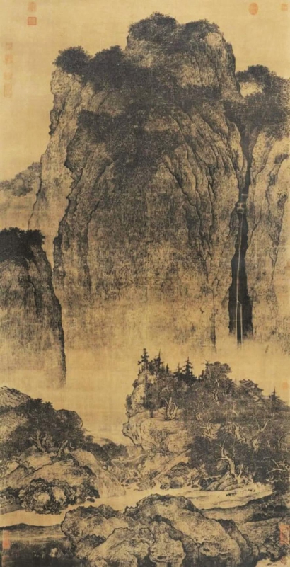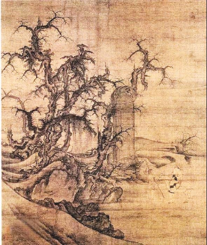 此時,除了在畫上簡單署上自己名款外,少有題記,有時甚至與觀賞者捉起迷藏,把自己的名款寫在樹干或山石之間。如范寬《溪山行旅圖》中“范寬”二字就寫在畫的右下角樹蔭下。郭熙《窠石平遠圖》在畫幅左方中部用隸書小字寫了“窠石平遠,元豐戊午郭熙畫”。梁師閔的《蘆汀密雪圖》,其“蘆汀密雪臣梁師閔畫”的署款就落在畫幅后端中部。所有這些題跋都落在畫中不起眼的地方,也是這一時期的獨特形式。