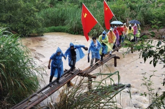 2019年6月11日至8月18日,中央宣傳部組織開展了“壯麗70年·奮斗新時代——記者再走長征路”主題采訪活動,先后有1300余名記者追隨當年紅軍長征步伐,深入實地采訪,累計跨越16000余公里,推出10000余篇鮮活生動、形式多樣的報道,網(wǎng)上總閱讀量近20億次。習近平總書記近日對“記者再走長征路”主題采訪活動作出重要指示強調,中央宣傳部組織開展的“記者再走長征路”主題采訪活動,生動再現(xiàn)壯懷激烈、驚天動地的革命故事,對闡釋用生命和鮮血鑄就的偉大長征精神很有意義。圖為6月13日,參加主題采訪活動的記者們,在江西于都縣祁祿山沿著當年中央紅軍長征走過的“紅軍小道”冒雨行進,體驗紅軍穿越深山峽谷的艱苦行程。經(jīng)濟日報記者 劉興/攝