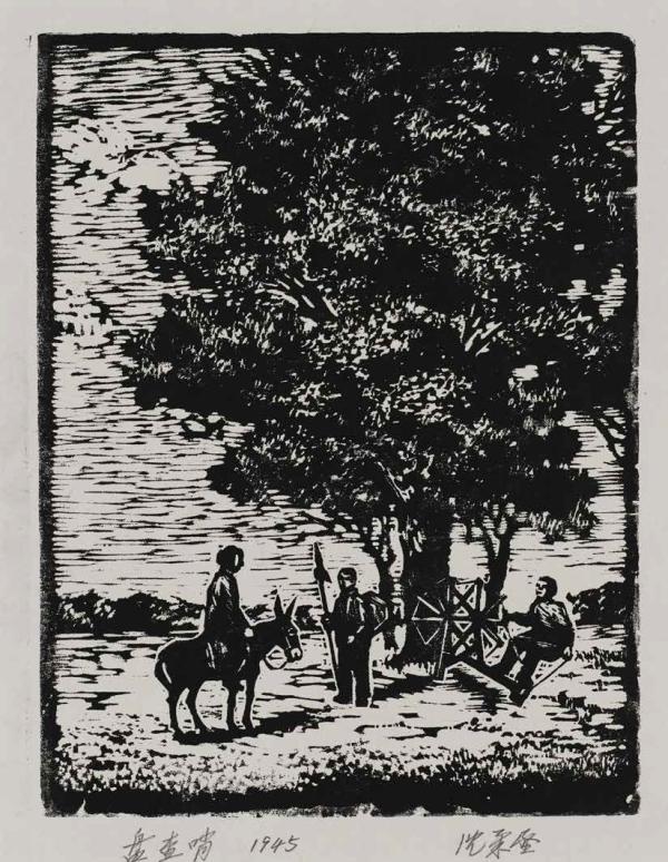 沈柔堅(jiān)在1938 年參加新四軍后開始從事美術(shù)創(chuàng)作,次年在皖南任新四軍戰(zhàn)地服務(wù)團(tuán)繪畫組組長(zhǎng),之后先后任抗日軍政大學(xué)文化科科長(zhǎng)、《新知識(shí)》雜志編委等職,創(chuàng)作了一批木版畫作品。抗戰(zhàn)勝利后,任山東省文化協(xié)會(huì)美術(shù)記者,創(chuàng)作了《盤查哨》《軍民同樂》《學(xué)文化》《慶功圖》《立功榮歸》《全力支持前線》等石版年畫和木版畫。其中《田野》《拾草》和《盤查哨》三件作品被法國軍事博物館征集收藏。