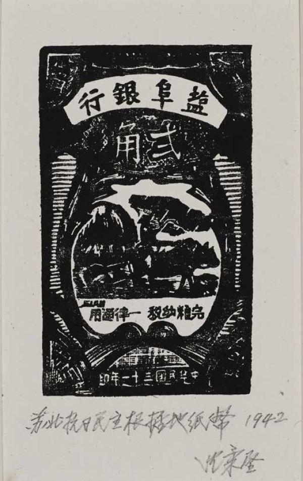 展開現(xiàn)場(chǎng)展出了沈柔堅(jiān)在1942年創(chuàng)作的抗幣,沈柔堅(jiān)在《以木刻畫作抗幣瑣記》中寫到,“1942年春,鹽阜區(qū)根據(jù)地開始建立鹽阜銀行時(shí),需要發(fā)行貨幣,但苦于無制版條件。當(dāng)時(shí)銀行行長(zhǎng)駱耕漠同志托里程同志帶了封信到鹽阜報(bào)社找我,問我是否能用木刻圖案形式刻制鈔票,以便上機(jī)直接印刷。我說試試看,可用黃楊木。接此任務(wù)后,我便著手按大小票面設(shè)計(jì)畫稿。經(jīng)研究選定一橫一直各一種。駱耕漠同志看到后高興地說,真想不到木刻畫也可以做鈔票,用木刻畫印鈔票,風(fēng)格刀法不同,別人很難假冒。我說,我只會(huì)刻畫不會(huì)刻字,用木刻刀刻字真費(fèi)勁,‘1942年’的‘9’字刻反了怎么辦?重刻如何?銀行同志說,不要緊,這樣更假不了。我自己只保存拓印的一些原稿,原版便交給了銀行。不久鈔票正式印出并發(fā)行,我記得是用牛皮紙印成深藍(lán)色的,上面還蓋了銀行和行長(zhǎng)的兩方朱紅色的小圖章,人們?yōu)樽约旱娜嗣裾状伟l(fā)行貨幣而喜悅,我看到木刻畫藝術(shù)在革命根據(jù)地能在各方面發(fā)行,感到格外高興?!?/p>