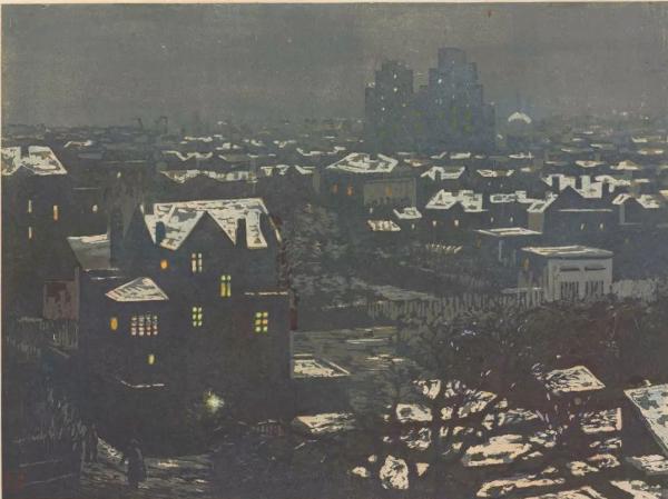 在展覽中,《上海展覽館》《浦江夕照》和《雪后》勾起了很多人的上海記憶,作于1957年的《雪后》畫家以寧靜抒情的雪夜表現(xiàn)美好的意愿。寒冷之夜中卻透著人性的溫暖,如同聽到了畫家的獨(dú)白和夜的歌曲。展覽還將多件版畫和繪畫作品并列展陳,從其中也可以看出多個(gè)畫種的繪畫語言是如何互相影響和借鑒。