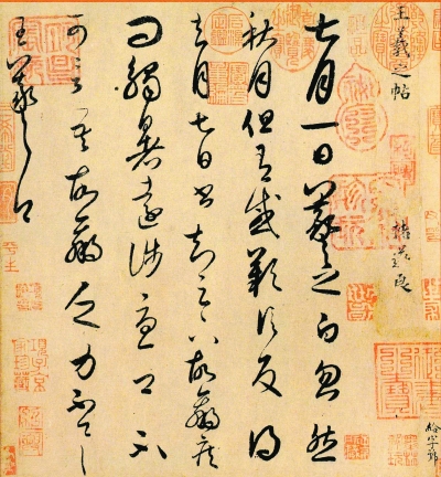 王羲之草書(shū)手札《秋月帖》摹本,又稱《七月帖》,麻紙,縱27.7 厘米,橫25.8厘米,現(xiàn)藏臺(tái)北故宮博物院。