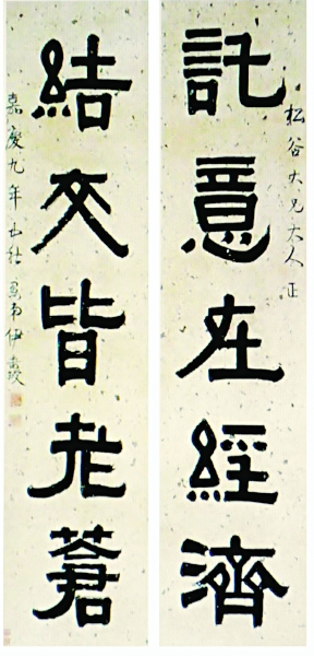 伊秉綬隸書(shū)源于漢隸,又有創(chuàng)新,古拙開(kāi)張,融入顏體的挺拔、正直,變“蠶頭燕尾”、一波三折為沉著平直,收筆含蓄,筆法極簡(jiǎn),保留了篆書(shū)中段用筆,橫平豎直和帶弧度的撇捺,妙趣橫生。字形結(jié)構(gòu)方正飽滿,中宮疏朗,筆畫(huà)向四周開(kāi)張。