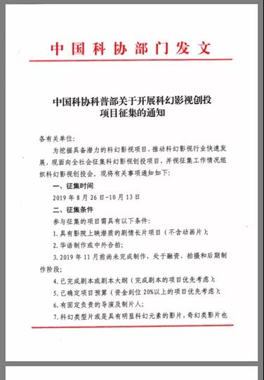 為了繁榮科幻影視創(chuàng)作、挖掘孵化具有市場潛力的科幻影視項目,2019中國科幻大會還特別設(shè)置科幻電影創(chuàng)投環(huán)節(jié),由中國科協(xié)科普部于8月28日正式公布了《關(guān)于開展科幻影視創(chuàng)投項目征集通知》。