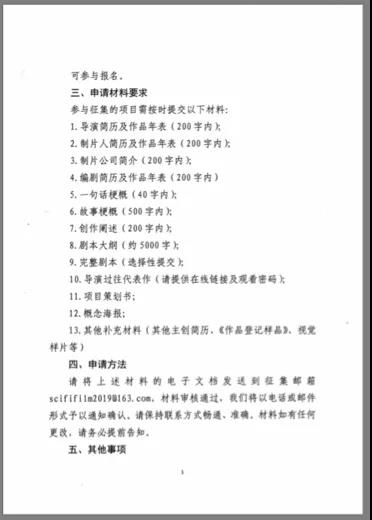 請將上述材料的電子文檔發(fā)送到征集郵箱scififilm2019@163.com,材料審核通過,我們將以電話或郵件形式予以通知確認。請保持聯(lián)系方式暢通、準(zhǔn)確。材料如有任何更改,請務(wù)必提前告知。