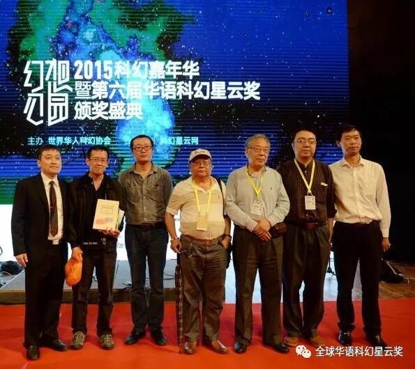 時任世界華人科幻協(xié)會會長 吳巖(左一),副會長 韓松、劉慈欣、王晉康、何夕,常務(wù)副會長兼秘書長姚海軍,監(jiān)事長董仁威(中)于2015年六屆星云獎成都嘉年華