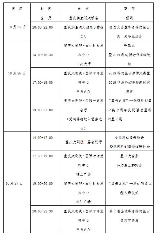 本次活動將由第十屆全球華語科幻星云獎頒獎典禮、科幻星云群英會、第二屆科幻電影星云獎頒獎典禮、2019科幻星云原作大賽、2019黃金星云科幻論壇等部分組成。為方便受邀嘉賓與已報名人員參會(因場地有限,不再接受新的報名),特將日程安排公布如下: