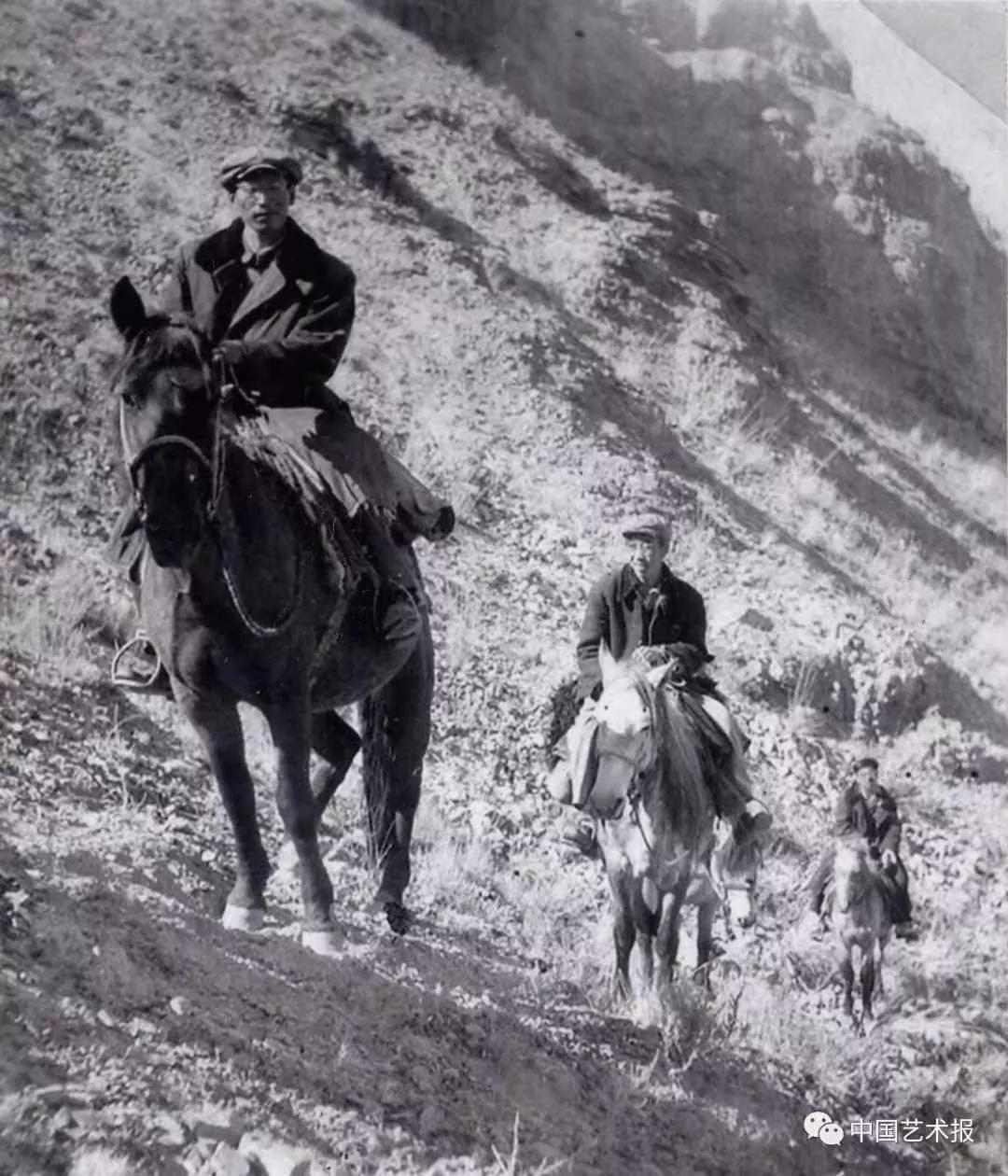 1964年,《瑪納斯》調(diào)查采錄組成員陶陽(左)、劉發(fā)俊(中)、趙潛德(右)在騎馬前往新疆阿合奇縣的路上
