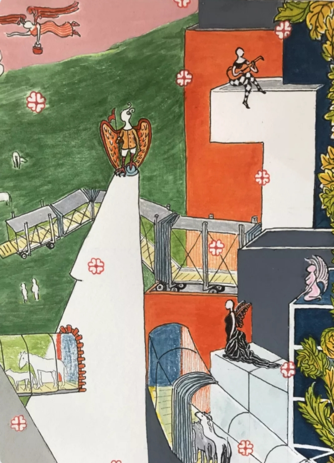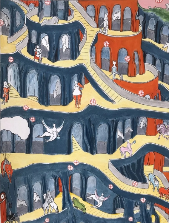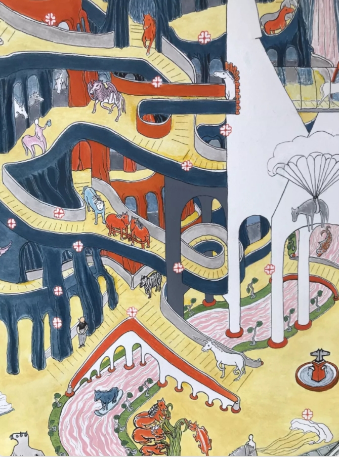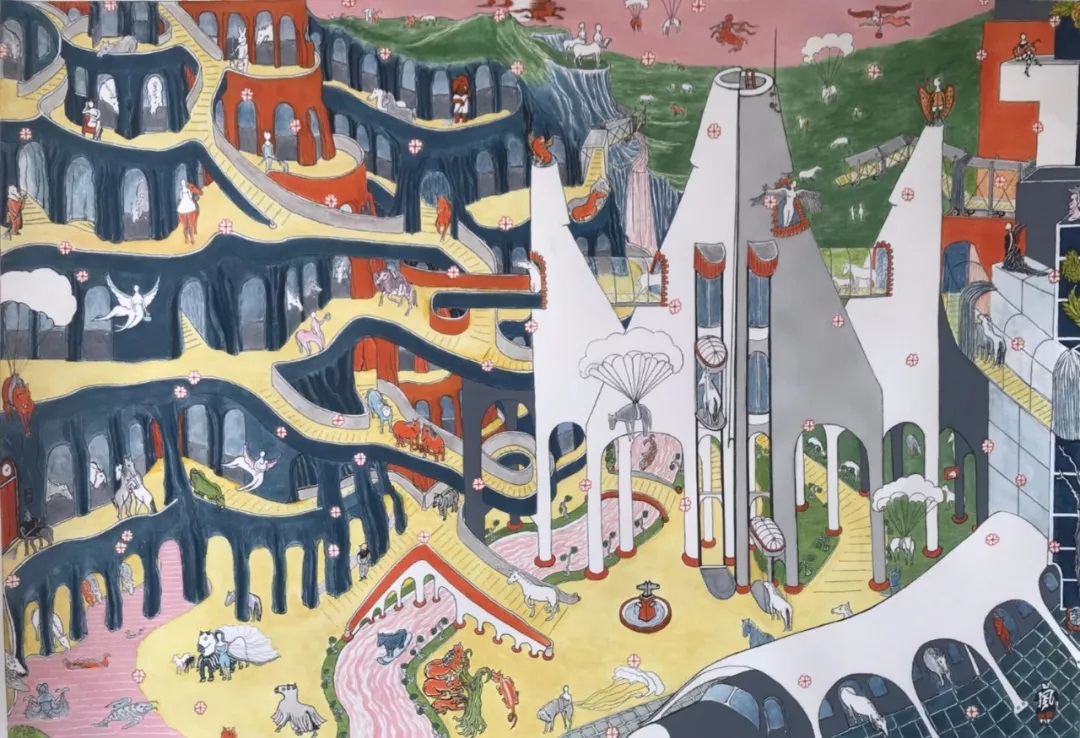 畫中不少形象,出自《山海經(jīng)》、西漢織物殘片及古墓、中世紀(jì)的壁畫。桃花,也就是我們打開微信“生日快樂”,紛紛揚(yáng)揚(yáng)落下來的那種效果,使現(xiàn)場變得更真實(shí)、更生動(dòng)。