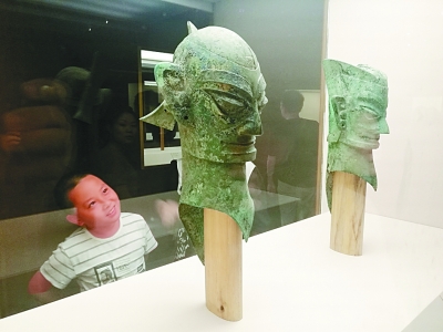 一位小觀眾對國家博物館“古蜀華章展”中的青銅頭像產(chǎn)生了興趣。本報記者李韻攝/光明圖片