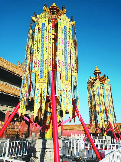 今年春節(jié)期間立在紫禁城乾清宮前的萬壽燈。作為故宮博物院最大的文創(chuàng)產(chǎn)品,春節(jié)過后,它與同時制作的天燈、幾組宮燈一起進(jìn)行公益拍賣,款項全部捐贈貧困地區(qū)用于兒童教育。本報記者李韻攝/光明圖片