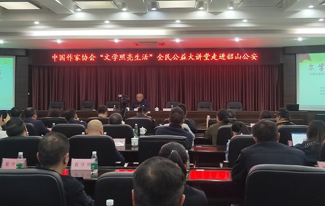 22日下午,與會(huì)作家分為三組開展活動(dòng)。第一組李文朝、驃騎等20余位作家跟隨中國作協(xié)“文學(xué)照亮生活”全民公益大講堂走進(jìn)湖南韶山公安局。原海軍政治部文藝創(chuàng)作室主任、編劇朱秀海為學(xué)員以及韶山市公安局文學(xué)愛好者帶來題為“文學(xué)的力量和作家的使命”的講座。朱秀海從自身的從軍經(jīng)歷和創(chuàng)作經(jīng)歷出發(fā),談到部隊(duì)作家如何通過創(chuàng)作為人民服務(wù),他認(rèn)為軍隊(duì)作家一要完成部隊(duì)交代的任務(wù);二是用創(chuàng)作為中華民族的偉大復(fù)興服務(wù)。在他看來,愛國主義和英雄主義是軍事文學(xué)中永恒的主題,也是人性的最佳體現(xiàn)。最后朱秀海還談到《喬家大院》的創(chuàng)作過程,希望通過喬家大院這一題材告訴觀眾,在農(nóng)耕社會(huì)之外,中國人早就發(fā)現(xiàn)了另外一條生存下去的道路,這就是走商品經(jīng)濟(jì)的道路。
