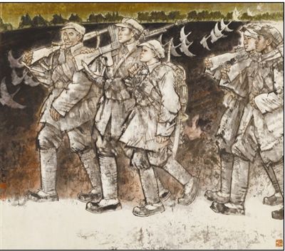 軍旅題材美術(shù)作品塑造了各時期保家衛(wèi)國的中國軍人形象,以及我軍現(xiàn)代化建設(shè)取得的成就。早在上世紀(jì)50年代,有組織的軍事美術(shù)創(chuàng)作活動便成為新中國美術(shù)發(fā)展的重要組成部分。其中,羅工柳油畫《地道戰(zhàn)》、董希文油畫《紅軍不怕遠(yuǎn)征難》、潘鶴雕塑《艱苦歲月》,以及人民英雄紀(jì)念碑浮雕,都是這個時期的佳作。此后,中國人民解放軍的群眾性美術(shù)創(chuàng)作獲得長足發(fā)展,無論現(xiàn)實(shí)題材還是軍事歷史畫都佳作頻出,比如陳逸飛油畫《黃河頌》、張道興中國畫《腳踏著祖國的大地》、邵亞川油畫《巡堤》等。