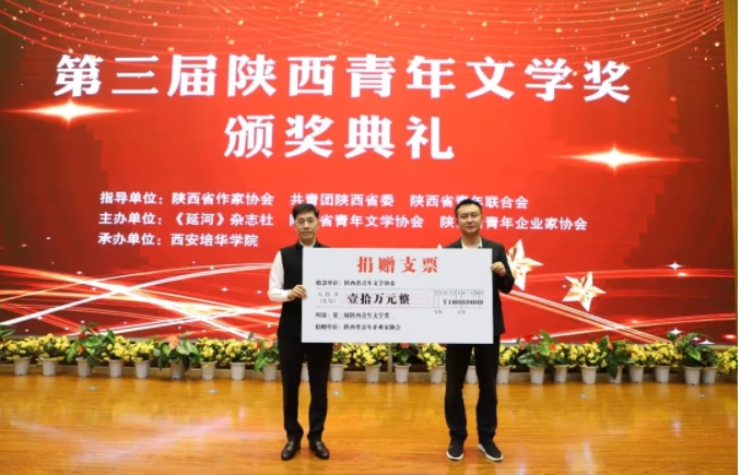 典禮現(xiàn)場(chǎng),陜西省青年企業(yè)家協(xié)會(huì)向陜西省青年文學(xué)協(xié)會(huì)捐贈(zèng)十萬(wàn)元,用于第三屆陜西青年文學(xué)獎(jiǎng)的頒發(fā)。
