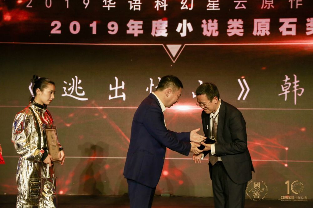 這是第十屆全球華語科幻星云獎頒獎典禮。董仁威是全球華語科幻星云獎的主要創(chuàng)始人之一?!靶窃篇勀芘e辦到第十屆,本身就是一個奇跡般的科幻故事。”董仁威感慨道。