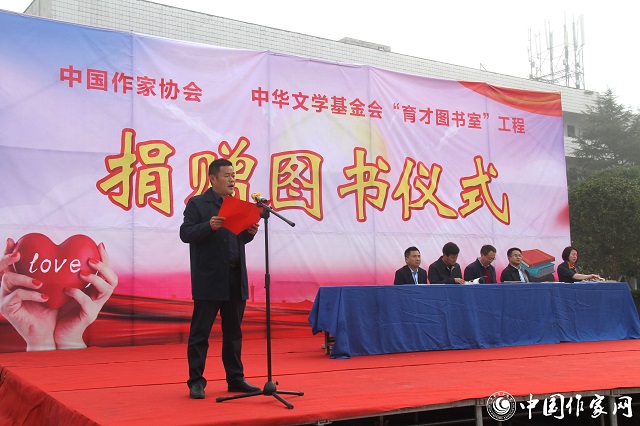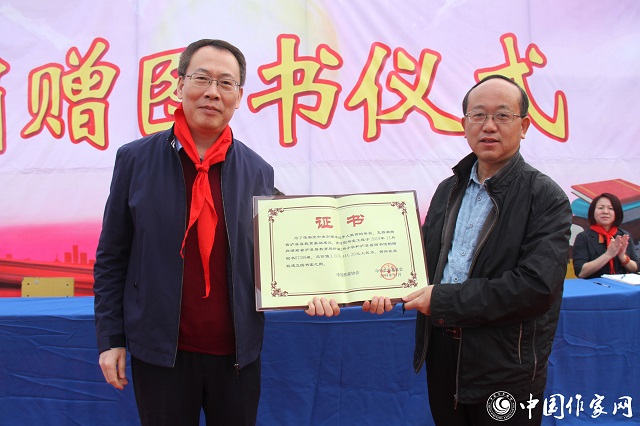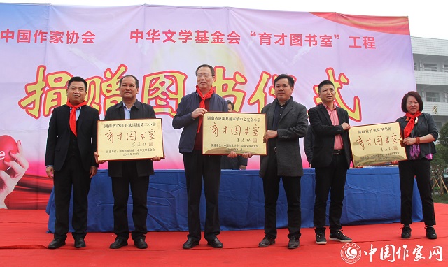 11月4日上午,中國作家協(xié)會、中華文學基金會“育才圖書室”工程向湖南省湘西土家族苗族自治州瀘溪縣圖書捐贈儀式在瀘溪縣浦市鎮(zhèn)中心完全小學舉行。中華文學基金會秘書長鮑堅,中國作協(xié)創(chuàng)聯(lián)部主任彭學明,瀘溪縣人民政府縣長向恒林、副縣長尚遠道、縣教體局局長譚子好,以及浦市中心完小3000余名師生參加了捐贈活動。捐贈儀式由瀘溪縣委宣傳部長向夢華主持。