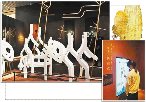 左圖 人騎馬甲骨文展示。 右圖 展覽現(xiàn)場(chǎng),觀眾可以自己制作甲骨文祝??ㄆ?。 佘 穎攝
