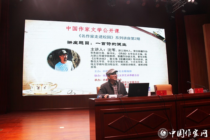 19日上午,沈葦在內(nèi)蒙古師范大學(xué)作題為“一首詩(shī)的誕生”的講座。沈葦談到,一首詩(shī)的誕生其實(shí)是一個(gè)秘密,講出來(lái)帶有某種冒險(xiǎn)性,但文學(xué)不是閉門造車,是用來(lái)交流、分享,詩(shī)歌可以點(diǎn)亮一個(gè)人的心靈。結(jié)合自己30多年的詩(shī)歌創(chuàng)作,沈葦具體分析了《一個(gè)地區(qū)》《加沙地道》《沙》《兩個(gè)故鄉(xiāng)》《開(kāi)度河畔與一只螞蟻共度一個(gè)下午》《樓蘭美女》等詩(shī)的誕生機(jī)緣和背景。一首詩(shī)可以誕生于閱讀,《加沙地道》就是沈葦在讀了美國(guó)記者關(guān)于加沙地道的報(bào)道之后寫下的。而寫于1992年的《開(kāi)度河畔與一只螞蟻共度一個(gè)下午》則誕生于沈葦?shù)哪撤N“無(wú)聊”的心緒,他從觀察一只螞蟻開(kāi)始,逐漸步入更深層次的沉思,最后實(shí)現(xiàn)了與螞蟻的平等對(duì)話。沈葦總結(jié),一首詩(shī)的誕生看似是突如其來(lái)的、可遇而不可求的,實(shí)際上得益于持久的期待、長(zhǎng)久的觀察和沉思,是耐心的產(chǎn)物,本質(zhì)上是對(duì)虛無(wú)的反抗。