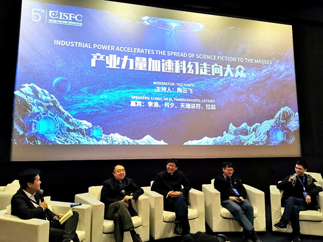 產(chǎn)業(yè)力量推動(dòng)科幻文學(xué)走向大眾”分論壇現(xiàn)場(chǎng) (左至右:閱文集團(tuán)出版內(nèi)容部總監(jiān) 陶云飛、知名科幻作家 何夕、科幻世界雜志社副總編輯 拉茲、閱文集團(tuán)科幻頻道資深編輯 李浩、閱文集團(tuán)旗下作家 天瑞說(shuō)符)