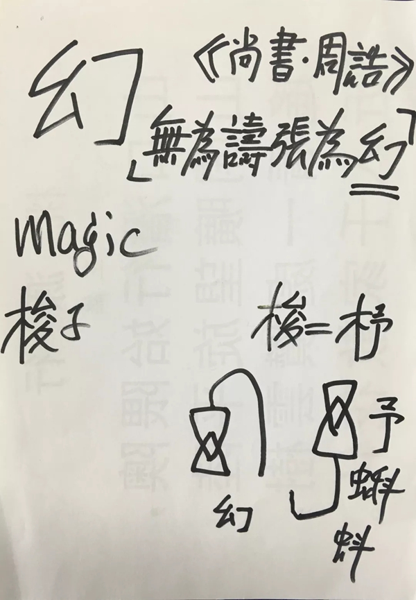 流沙河:“幻”就是變化的意思,變得你完全認(rèn)不出來了。我來畫給你看。這個(gè)字古代就有了。古代見于《尚書》,三千年了。這是原文,周朝政府下的命令,謊言為幻,用來騙人,指的是什么?就是周公那時(shí)候,社會(huì)上有很多變魔術(shù)的人,后來把魔術(shù)叫作幻術(shù)。周代的人不準(zhǔn)許這個(gè),所以這個(gè)“幻”字已經(jīng)非常古老,研究文字發(fā)現(xiàn)它是這樣來的。這個(gè)字就是“幻”。