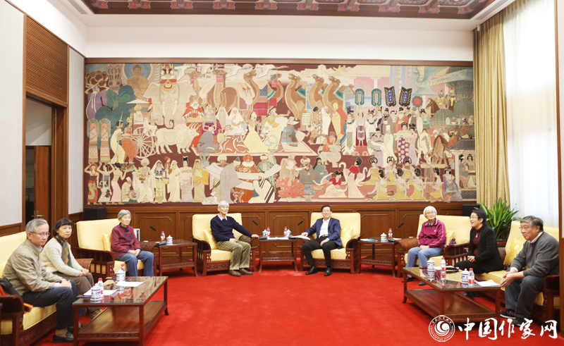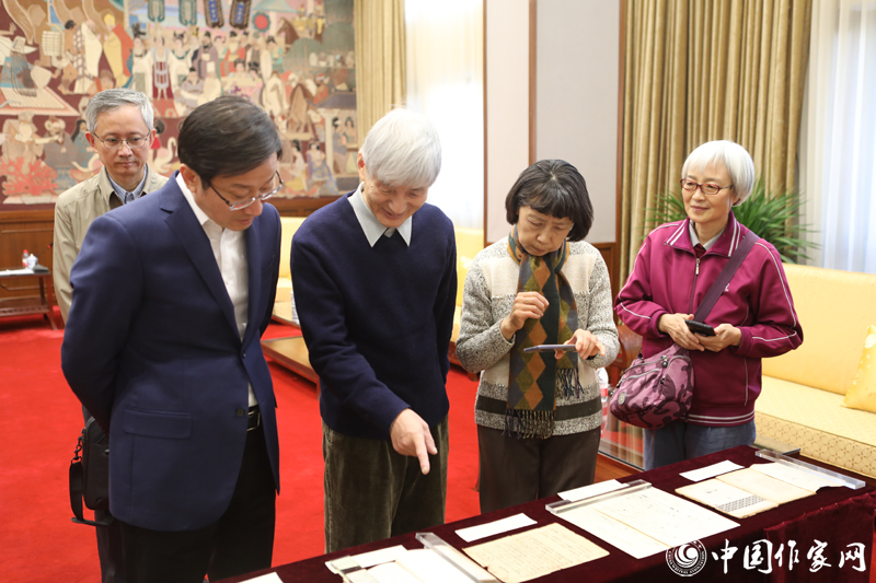 國家圖書館館長饒權(quán)(左二)與楊晦先生子女共同觀看楊晦先生手稿等珍貴文獻(xiàn)