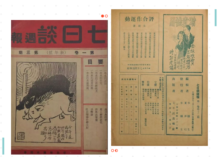 《七日談周報》第1卷第3期封面(左)和《七日談周刊》第1卷第12期版權(quán)頁(右)
