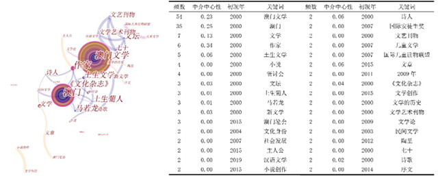 基于數(shù)據(jù)分析,“土生文學(xué)”、“土生葡人”是二十年澳門文學(xué)研究的高頻詞,《澳門文學(xué)源流與涵義之辨析》(張劍樺:《廣西師范大學(xué)學(xué)報(bào)(哲學(xué)社會(huì)科學(xué)版)》2009年第6期)中將澳門文學(xué)界定為一種“植入式文學(xué)”,認(rèn)為其缺乏“根生性文學(xué)”元素。上述關(guān)鍵詞的出現(xiàn)論證了澳門的歷史性、地域性與跨文化性,其高頻次則證實(shí)了地域文化與文學(xué)書寫的關(guān)系成為澳門文學(xué)的基本的研究視角?!霸姼琛薄ⅰ霸娙恕奔啊靶≌f”、“小說創(chuàng)作”提示著澳門文學(xué)的主流研究領(lǐng)域,尤其是詩歌,高中心度的數(shù)據(jù)揭示了詩歌在澳門文學(xué)體系中的主體地位。高頻詞“文藝刊物”、“文學(xué)藝術(shù)刊物”、“文化雜志”佐證了澳門文學(xué)副刊化現(xiàn)狀。澳門詩歌、散文的發(fā)表與傳播依賴文學(xué)雜志及文學(xué)副刊,因而媒介研究可成為澳門文化生態(tài)研究的另一個(gè)視角。“新文學(xué)”和“漢語文學(xué)”兩個(gè)關(guān)鍵詞反映出澳門文學(xué)已被納入“漢語新文學(xué)”研究視閾,《澳門文學(xué)與漢語文學(xué)的后現(xiàn)代感興》(朱壽桐:《社會(huì)科學(xué)輯刊》2019年第3期)與《澳門文學(xué)與漢語新文學(xué)的理論啟示》(朱壽桐《南方文壇》2019年第4期)闡述了澳門經(jīng)驗(yàn)對(duì)于漢語新文學(xué)領(lǐng)域的獨(dú)特貢獻(xiàn)。