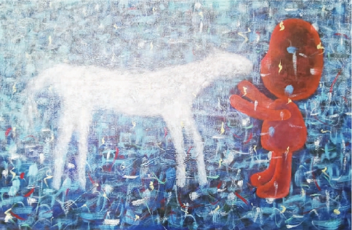 今年恰逢內(nèi)蒙古首屆國際馬文化博覽會舉辦,內(nèi)蒙古自治區(qū)上下都在為弘揚蒙古馬精神、建設(shè)新時代的內(nèi)蒙古而殫精竭慮,本次展覽正好契合了這個主題。什么是蒙古馬精神?我以為就是自強、樂觀、自由、寬容、腳踏實地、不畏艱苦、團結(jié)奮進??v觀展出的作品,我確實感受到了藝術(shù)家們對蒙古馬精神的獨到理解和闡釋。形式上,他們不拘泥于馬的具象化表征,摒棄了模式化的創(chuàng)作思維,而更多的是以或抽象、或卡通、或具有符號化的,甚至是變形的方法,表現(xiàn)馬的形態(tài)和生命內(nèi)涵,以及馬所象征的人的精神力量。在藝術(shù)手法上他們更是大膽嘗試,不光有油畫、丙烯、水彩、國畫、木刻、雕塑還有銅版畫以及馬克筆繪制的作品。比如金剛的《鞍馬史詩》 ,用舊馬車的轅木、舊馬鞍和馬飾以及廢棄的門板組合成馬的幾何形狀,給人一種古樸的空間感和時間感。吳智彬的《浮城》則以馬克筆細密的筆觸描繪了一個既逼真又幻象的超現(xiàn)實世界。蘇德巴特爾的油畫《戰(zhàn)神》將傳統(tǒng)裝飾與現(xiàn)代卡通融為一體,描摹了以長生天和戰(zhàn)馬為核心的蒙古精神,極具想象力。青格爾的油畫《蒙古臉譜》給我印象尤為深刻,他以仿蒙古族傳統(tǒng)皮雕的形式,將漫畫和裝飾畫的筆法融入他的構(gòu)圖,那一個個擠壓在似煙囪和管道中的臉,隱喻了現(xiàn)代性與游牧文明的沖撞和融合。展覽策展人莫尼的作品也給人與眾不同的感受,他的油畫《沉默的他們》系列作品將代表草原游牧精神的馬與當(dāng)代社會的眾聲喧嘩進行比照,使沉默產(chǎn)生了形而上的寓意。而另一位策展人朝魯?shù)挠彤嫛厄T士》 ,則借鑒了古代壁畫和巖畫的形態(tài),粗糲而富有歷史氣息。孫玉寶的《冬牧》以現(xiàn)代水墨的手法,表現(xiàn)了在嚴酷的自然環(huán)境中牧人與馬的依存關(guān)系。而錢達木尼的丙烯《尋· 3》中的馬被賦予了蒙古族人崇尚的藍色,將馬的姿態(tài)、節(jié)奏與大自然的絢爛融為一體,具有很強的表現(xiàn)主義風(fēng)格。靳雙雙的油畫《花花世界的幻想》則是一個“90后”城市女孩對馬和牛的奇妙的想象,畫面清新、淡雅,有水彩般的透明感。此外,油畫或丙烯類還有芬筍得日的《無聲的自述》 、李旭東的《晨曲》 、旭日花的《草原印象》 、白嘎力的《浮影》 、孟和琪琪格的《靜謐》 、蘇龍嘎的《夢》 、旭日嘎的《15℃》以及段琦琦的《同在》 ;國畫有海日汗的《天靈》 、敖寶林的《鬃飛》 、孟和烏力吉的《藍騎士》 ;雕塑有薩其日拉圖的《牧馬人系列:初戀》 、高貝的《敕勒川印象》 、岳布仁的《草原戀》 ;水彩有那日蘇的《風(fēng)馬》 ;版畫有伊蘭納的A t T h a t M o m e n t等,這次展覽既以“80后” “90后”為主體,又以上世紀五六七十年代出生的藝術(shù)家為先導(dǎo),形式多種多樣,內(nèi)容豐富多彩,受到社會各界的關(guān)注和好評。