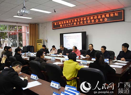 人民網(wǎng)南寧12月31日電 2019年12月21日,由廣西古代文學(xué)學(xué)會(huì)、廣西民族大學(xué)國(guó)學(xué)院主辦,廣西民族大學(xué)文學(xué)院協(xié)辦的“第三屆民族地區(qū)古典文學(xué)研究新動(dòng)態(tài)高端論壇暨2019廣西古代文學(xué)學(xué)會(huì)年會(huì)”在廣西民族大學(xué)逸夫?qū)嶒?yàn)樓舉行,來(lái)自廣西大學(xué)、廣西民族大學(xué)、南寧師范大學(xué)等區(qū)內(nèi)十余所高校、科研機(jī)構(gòu)的四十余名代表參加會(huì)議。