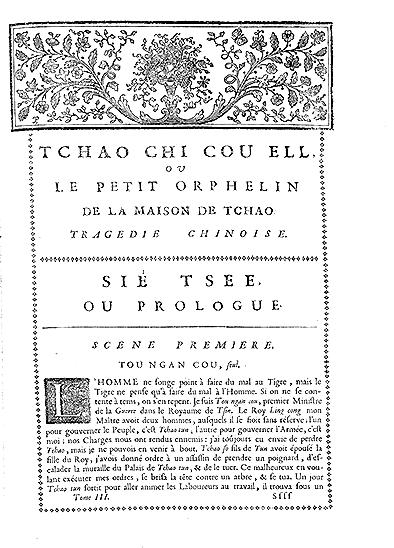 大文豪伏爾泰(Voltaire,1694-1778)在他根據(jù)《趙氏孤兒》改編而成的《中國(guó)孤兒》(L’O rphelin de la Chine)的《獻(xiàn)詞》(Epitre)中這樣評(píng)價(jià)這篇譯文:“《趙氏孤兒》是一部珍貴的大作,它使人了解中國(guó)精神,勝過(guò)人們已經(jīng)做過(guò)的以及將來(lái)要做的關(guān)于這個(gè)大帝國(guó)所有之陳述?!痹?8世紀(jì)“啟蒙運(yùn)動(dòng)”的時(shí)代,《趙氏孤兒》在西方首次彰顯了中國(guó)人與黑暗勢(shì)力堅(jiān)決斗爭(zhēng),為正義事業(yè)前仆后繼的英勇形象,第一次在海外奏出了中國(guó)人的強(qiáng)音。