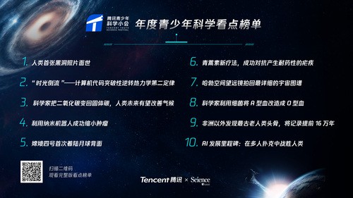 會上,騰訊與Science連續(xù)第二年共同推出《青少年科學(xué)看點(diǎn)榜單》,今年投票參與的青少年人數(shù)從去年的10萬猛增至120萬。投票結(jié)果顯示,包括黑洞、月球探測等在內(nèi)的天文學(xué)話題最受中國青少年關(guān)注。