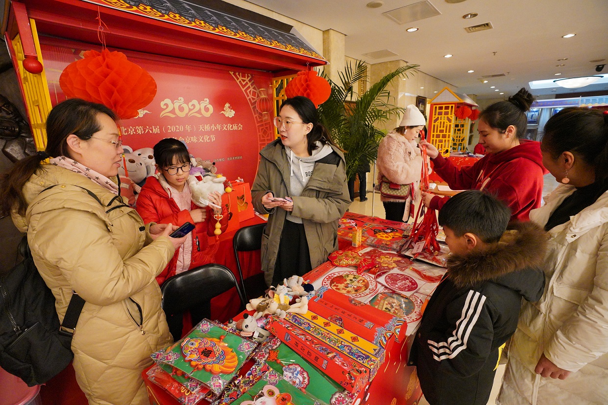 天橋小年文化廟會現(xiàn)場,觀眾興致勃勃地參與展賣。