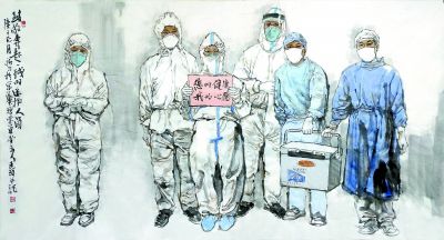 疫情面前,北京美協(xié)中國(guó)畫(huà)藝委會(huì)委員彭華競(jìng)第一時(shí)間拿起畫(huà)筆,畫(huà)出人民解放軍戰(zhàn)士宣誓、赴疫情一線等感人瞬間?!半m然不能和他們一樣奔赴一線并肩作戰(zhàn),但我能用手中的畫(huà)筆為他們?cè)煜?,謳歌抗疫英雄,鼓舞人們斗志!”彭華競(jìng)的作品中,無(wú)論是醫(yī)務(wù)人員還是解放軍戰(zhàn)士,都擁有堅(jiān)定的眼神。他說(shuō),這眼神正在迎向勝利的曙光,帶給人們希望。