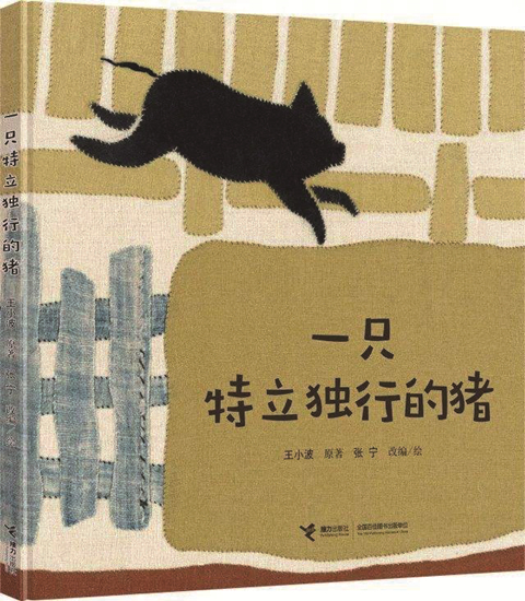 圖畫書《一只特立獨(dú)行的豬》則又是另一種“共生演化”,原文本是王小波的同名雜文,其文其意可能均非為兒童所能理解。但張寧對(duì)原著進(jìn)行了視角轉(zhuǎn)換、抽離復(fù)雜時(shí)代背景、增添小豬成長(zhǎng)細(xì)節(jié)和兒童見(jiàn)證者等一系列大刀闊斧的改編,從而實(shí)現(xiàn)了成人文學(xué)的兒童化。這種兒童化絕非幼稚化,因?yàn)樵凶杂伞⒆詮?qiáng)和獨(dú)立的精神內(nèi)核被完整地保留了下來(lái)。為了表現(xiàn)原著內(nèi)蘊(yùn)的精神力量,張寧采用“剪布法”并借鑒古樸的漢畫風(fēng)格來(lái)鋪展故事。布藝拼貼畫面所呈現(xiàn)的強(qiáng)烈肌理質(zhì)感與質(zhì)樸、溫暖的氣息和原著所要傳遞的精神有著高度的匹配性。最終,這本圖畫書延展出文字的觸須所無(wú)法抵達(dá)的另一層表意空間,完成了一種智性精神的代際傳遞與演化。