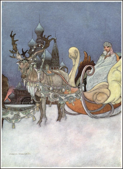 以前介紹過查爾斯·羅賓遜為莎士比亞十四行詩所作的插圖。倫敦的達(dá)克華斯出版公司,在二十世紀(jì)上半葉以善于發(fā)掘優(yōu)秀的文學(xué)作品而蜚聲英美。1913年,他們聘請羅賓遜為一部限量發(fā)行的王爾德童話集創(chuàng)作了一整套插圖,初版只出售兩百五十部,不過后來曾多次重印。這幅彩色插圖,將故事的開頭描摹得惟妙惟肖:公主坐著六匹馴鹿拉的雪橇從芬蘭來出嫁:“雪橇的形狀像一只金色的大天鵝。小公主本人就坐在天鵝的兩只翅膀中間。她那件白鼬皮的長披風(fēng)覆蓋到她的腳下,頭上戴了一頂銀色織物做的小帽子,臉色蒼白得就像她向來所居住著的雪宮的顏色?!?/p>