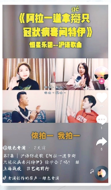 本地話(huà)是最容易走通人心的語(yǔ)言。在金山,歡笑主播以當(dāng)?shù)卦?huà)搭配手語(yǔ),用金山區(qū)居民最親切的語(yǔ)言為防疫抗疫工作鼓勁。在青浦,恒星樂(lè)團(tuán)的幾位年輕人創(chuàng)作了一支滬語(yǔ)歌曲《阿拉一道拿搿只冠狀病毒悶特伊》,亦莊亦諧的氛圍下,道出全民參與疫情防控的心聲與要點(diǎn)。王淵超已是滬上頗有名氣的音樂(lè)人,近年來(lái),他原創(chuàng)的滬語(yǔ)歌曲在全年齡段市民里傳唱甚廣。