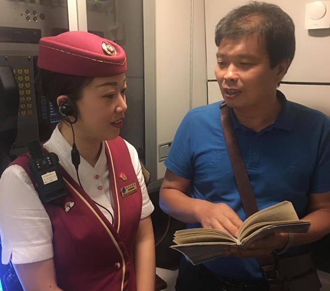 作家黃開建在高鐵工作中采訪先進人物高鐵列車長武麗