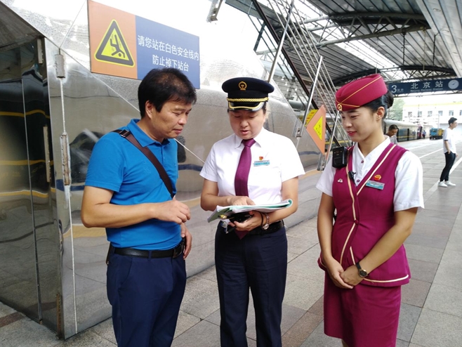 作家黃開建在北京站站臺上采訪高鐵列車員和車隊領(lǐng)導(dǎo)