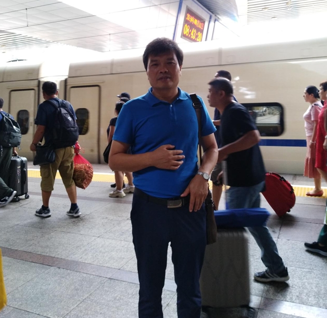 作家黃開建在人流如織的站臺上準備采訪普通旅客