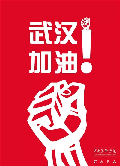 來自中央美術(shù)學(xué)院的張召林創(chuàng)作的海報(bào)《武漢加油!》紅底白字、構(gòu)圖簡(jiǎn)潔,沖擊力十足。海報(bào)的主體為一個(gè)緊握的拳頭,線條粗壯,結(jié)實(shí)有力。作者表示,希望用拳頭的力量感來表達(dá)戰(zhàn)勝疫情、戰(zhàn)勝困難的決心與信心。