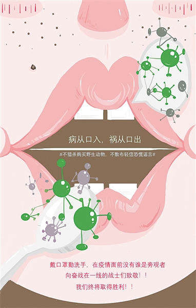 各大美術(shù)院校的同學(xué)們充分利用網(wǎng)絡(luò)平臺(tái),迅速分析和了解疫情防控的相關(guān)知識(shí),構(gòu)思、探討、打磨,從不同角度進(jìn)行海報(bào)創(chuàng)作。這些作品,有對(duì)中央應(yīng)對(duì)疫情工作精神的宣傳,有對(duì)新冠肺炎圖文并茂的科普知識(shí)介紹,也有對(duì)禁食野味、杜絕病毒傳播渠道的嚴(yán)肅強(qiáng)調(diào),更有對(duì)全民抗疫信心的鼓舞。每一幅疫情防控主題海報(bào)都是美院師生心系疫區(qū)、共克時(shí)艱的真情表達(dá)。