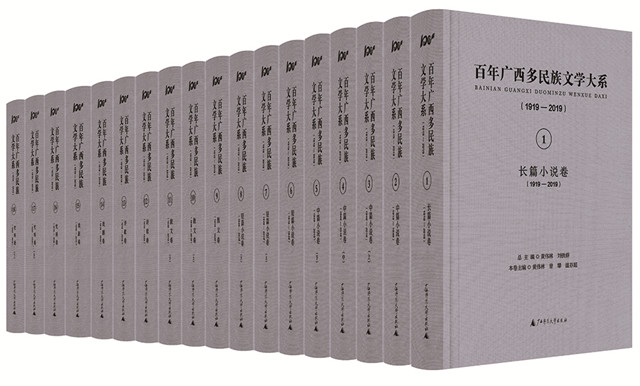 于是,便有了碩果《百年廣西多民族文學(xué)大系(1919-2019)》。時值新中國成立70周年,大系成竹在胸地展示了百年廣西文學(xué)的風(fēng)貌,帶著鮮明的歷史蹤跡、美學(xué)風(fēng)格和經(jīng)典化過程,便具有了紀(jì)念碑的意義。