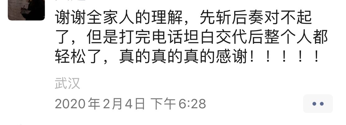 掛斷電話,越越心里松了一口氣,她打開朋友圈,定位到“武漢”,發(fā)了一條文字狀態(tài),向家人的理解表示感謝,也給自己接下來這場未知的戰(zhàn)“疫”打氣。