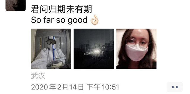 2月14日,越越又發(fā)了一條定位在“武漢”的朋友圈:“君問歸期未有期,so far so good.”照片中戴著口罩的越越難以掩蓋倦容,雨雪交加的武漢在黑夜中仍點亮著希望的明燈。
