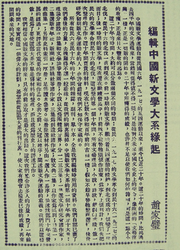 1935年3月15日刊行的《良友畫報(bào)》第103期上,有《中國(guó)新文學(xué)大系》系列廣告,其中包括趙家璧的《編輯中國(guó)新文學(xué)大系緣起》:“我們相信中國(guó)新文學(xué)的將來,只有向前進(jìn)取才是最大的出路。這次我們集合許多人的力量,費(fèi)了一年余的時(shí)間,來實(shí)現(xiàn)這一個(gè)偉大的計(jì)劃,希望能從這部大系的刊行里,使大家有機(jī)會(huì)去檢查已往的成績(jī),再來開辟未來的天地?!边@“許多人的力量”,落實(shí)在趙家璧所撰《<中國(guó)新文學(xué)大系>前言》,便是: