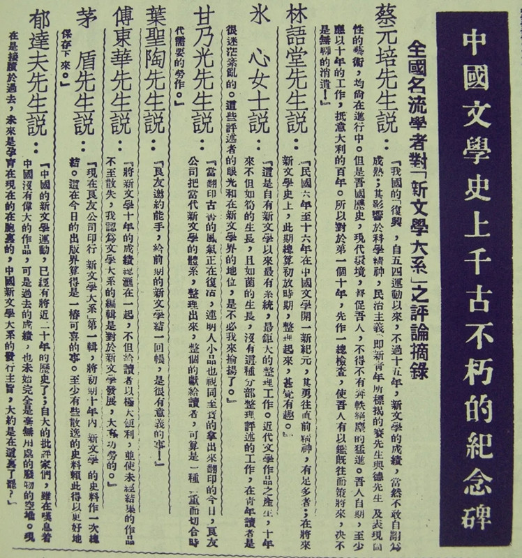 《良友畫報(bào)》第103期“全國(guó)名流學(xué)者對(duì)《新文學(xué)大系》之評(píng)論摘錄”