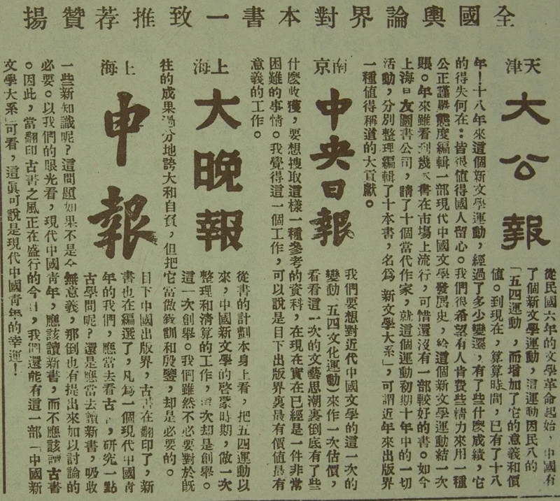 冰心女士說:“這是自有新文學(xué)以來最有系統(tǒng),最鉅大的整理工作。近代文學(xué)作品之產(chǎn)生,十年來不但如筍的生長(zhǎng),且如菌的生長(zhǎng),沒有這種分部整理評(píng)述的工作,在青年讀者是很迷茫紊亂的。這些評(píng)述者的眼光和在新文學(xué)界的地位,是不必我來揄揚(yáng)了?!?/span>