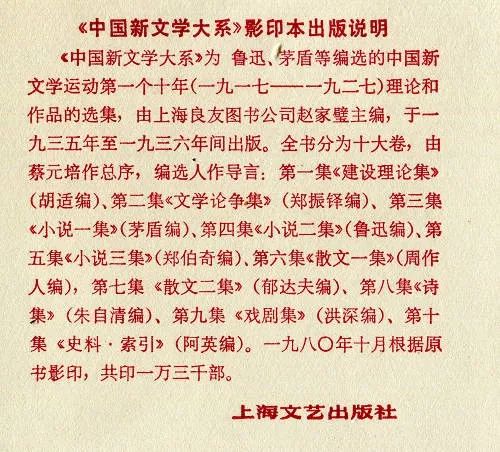 傅東華先生說:“將新文學(xué)十年的成績(jī)總匯在一起,不但給讀者以極大便利,并使未經(jīng)結(jié)集的作品不至散失,我認(rèn)為文學(xué)大系的編輯是對(duì)于新文學(xué)發(fā)展,大有功勞的?!?/span>