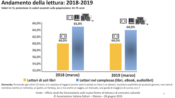 意大利的出版商會出書,也會賣書,這一點從它們積極參與建設(shè)網(wǎng)上書店便可以看出。同時,它們也重視讀者。意大利出版商協(xié)會的報告以PISA項目開篇,來引出他們對讀者情況的調(diào)查。以下是出版商協(xié)會給出的2018年與2019年14到75歲意大利人的閱讀情況: